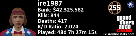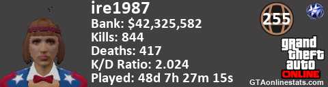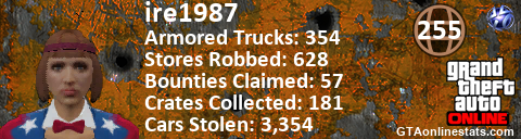 <a href="http://GTAonlinestats.com/showplayer/ire1987"><img src="http://GTAonlinestats.com/randomsignature/ire1987/sig.png" alt="ire1987" border="0" /></a>