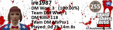 [URL=http://GTAonlinestats.com/showplayer/ire1987][IMG]http://GTAonlinestats.com/dmsignature/ire1987/sig.png[/IMG][/URL]
