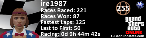 <a href="http://GTAonlinestats.com/showplayer/ire1987"><img src="http://GTAonlinestats.com/racesignature/ire1987/sig.png" alt="ire1987" border="0" /></a>