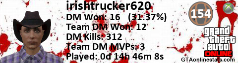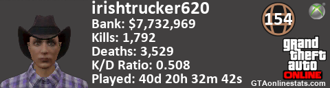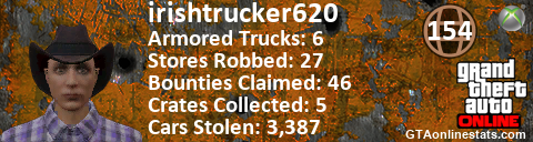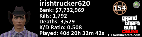 [URL=http://GTAonlinestats.com/showplayer/irishtrucker620][IMG]http://GTAonlinestats.com/signature/irishtrucker620/sig.png[/IMG][/URL]