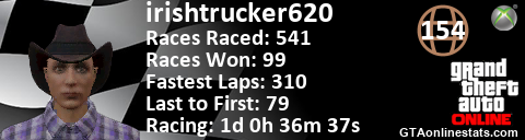 [URL=http://GTAonlinestats.com/showplayer/irishtrucker620][IMG]http://GTAonlinestats.com/racesignature/irishtrucker620/sig.png[/IMG][/URL]