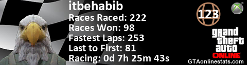 [URL=http://GTAonlinestats.com/showplayer/itbehabib][IMG]http://GTAonlinestats.com/racesignature/itbehabib/sig.png[/IMG][/URL]