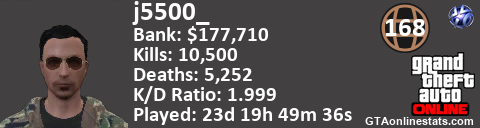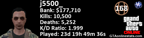 [URL=http://GTAonlinestats.com/showplayer/j5500_][IMG]http://GTAonlinestats.com/signature/j5500_/sig.png[/IMG][/URL]