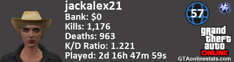 <a href="http://GTAonlinestats.com/showplayer/jackalex21"><img src="http://GTAonlinestats.com/randomsignature/jackalex21/sig.png" alt="Jackalex21" border="0" /></a>