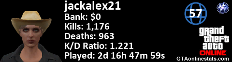 <a href="http://GTAonlinestats.com/showplayer/jackalex21"><img src="http://GTAonlinestats.com/signature/jackalex21/sig.png" alt="Jackalex21" border="0" /></a>