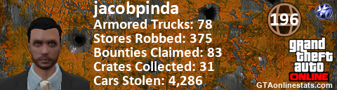 [URL=http://GTAonlinestats.com/showplayer/jacobpinda][IMG]http://GTAonlinestats.com/randomsignature/jacobpinda/sig.png[/IMG][/URL]