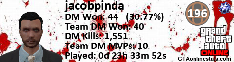 [URL=http://GTAonlinestats.com/showplayer/jacobpinda][IMG]http://GTAonlinestats.com/signature/jacobpinda/sig.png[/IMG][/URL]