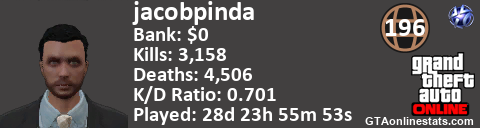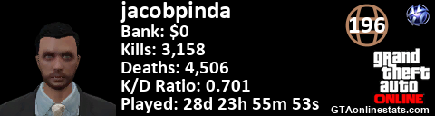 <a href="http://GTAonlinestats.com/showplayer/jacobpinda"><img src="http://GTAonlinestats.com/signature/jacobpinda/sig.png" alt="JacobPinda" border="0" /></a>