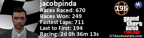 [URL=http://GTAonlinestats.com/showplayer/jacobpinda][IMG]http://GTAonlinestats.com/racesignature/jacobpinda/sig.png[/IMG][/URL]