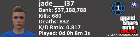 <a href="http://GTAonlinestats.com/showplayer/jade___l37/3"><img src="http://GTAonlinestats.com/randomsignature/jade___l37/3/sig.png" alt="jade___l37" border="0" /></a>
