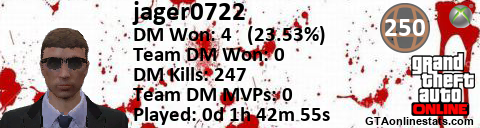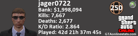 [URL=http://GTAonlinestats.com/showplayer/jager0722][IMG]http://GTAonlinestats.com/signature/jager0722/sig.png[/IMG][/URL]