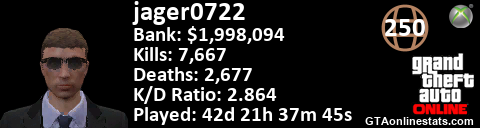 <a href="http://GTAonlinestats.com/showplayer/jager0722"><img src="http://GTAonlinestats.com/randomsignature/jager0722/sig.png" alt="jager0722" border="0" /></a>