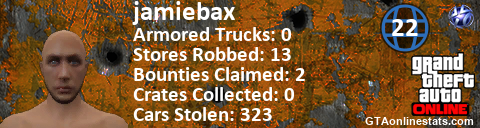 [URL=http://GTAonlinestats.com/showplayer/jamiebax][IMG]http://GTAonlinestats.com/crimesignature/jamiebax/sig.png[/IMG][/URL]