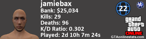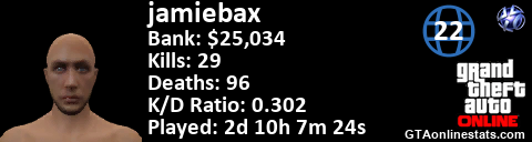<a href="http://GTAonlinestats.com/showplayer/jamiebax"><img src="http://GTAonlinestats.com/signature/jamiebax/sig.png" alt="jamiebax" border="0" /></a>