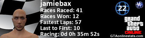 <a href="http://GTAonlinestats.com/showplayer/jamiebax"><img src="http://GTAonlinestats.com/racesignature/jamiebax/sig.png" alt="jamiebax" border="0" /></a>