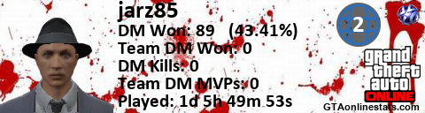 [URL=http://GTAonlinestats.com/showplayer/jarz85/2][IMG]http://GTAonlinestats.com/dmsignature/jarz85/2/sig.png[/IMG][/URL]