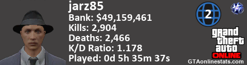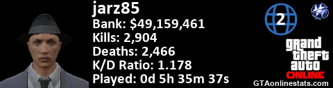[URL=http://GTAonlinestats.com/showplayer/jarz85/2][IMG]http://GTAonlinestats.com/greysignature/jarz85/2/sig.png[/IMG][/URL]