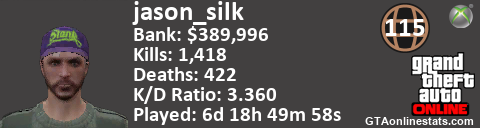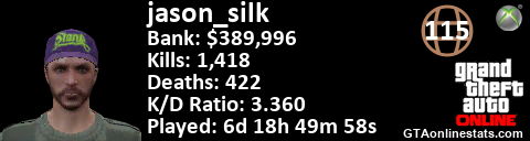 <a href="http://GTAonlinestats.com/showplayer/jason_silk"><img src="http://GTAonlinestats.com/dmsignature/jason_silk/sig.png" alt="jason_silk" border="0" /></a>