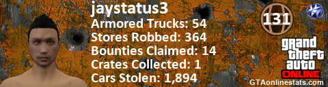 [URL=http://GTAonlinestats.com/showplayer/jaystatus3][IMG]http://GTAonlinestats.com/crimesignature/jaystatus3/sig.png[/IMG][/URL]