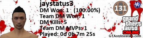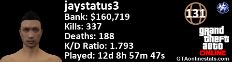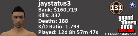 [URL=http://GTAonlinestats.com/showplayer/jaystatus3][IMG]http://GTAonlinestats.com/dmsignature/jaystatus3/sig.png[/IMG][/URL]