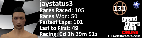 [URL=http://GTAonlinestats.com/showplayer/jaystatus3][IMG]http://GTAonlinestats.com/racesignature/jaystatus3/sig.png[/IMG][/URL]