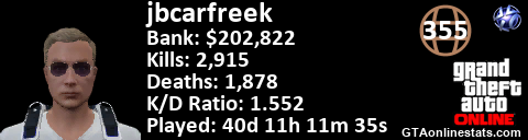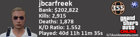 <a href="http://GTAonlinestats.com/showplayer/jbcarfreek"><img src="http://GTAonlinestats.com/randomsignature/jbcarfreek/sig.png" alt="jbcarfreek" border="0" /></a>