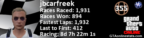 [URL=http://GTAonlinestats.com/showplayer/jbcarfreek][IMG]http://GTAonlinestats.com/racesignature/jbcarfreek/sig.png[/IMG][/URL]