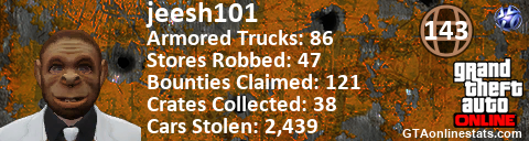 [URL=http://GTAonlinestats.com/showplayer/jeesh101/2][IMG]http://GTAonlinestats.com/randomsignature/jeesh101/2/sig.png[/IMG][/URL]