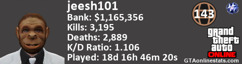 [URL=http://GTAonlinestats.com/showplayer/jeesh101/2][IMG]http://GTAonlinestats.com/signature/jeesh101/2/sig.png[/IMG][/URL]