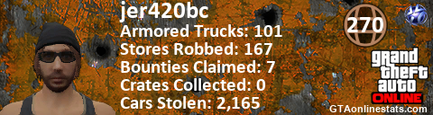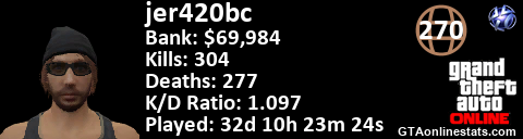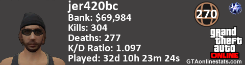 <a href="http://GTAonlinestats.com/showplayer/jer420bc"><img src="http://GTAonlinestats.com/randomsignature/jer420bc/sig.png" alt="jer420bc" border="0" /></a>