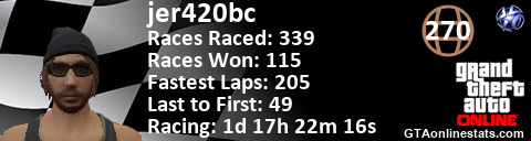 <a href="http://GTAonlinestats.com/showplayer/jer420bc"><img src="http://GTAonlinestats.com/racesignature/jer420bc/sig.png" alt="jer420bc" border="0" /></a>