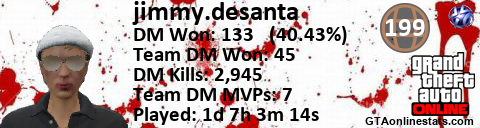 [URL=http://GTAonlinestats.com/showplayer/jimmy.desanta][IMG]http://GTAonlinestats.com/dmsignature/jimmy.desanta/sig.png[/IMG][/URL]