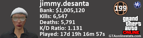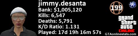 [URL=http://GTAonlinestats.com/showplayer/jimmy.desanta][IMG]http://GTAonlinestats.com/signature/jimmy.desanta/sig.png[/IMG][/URL]
