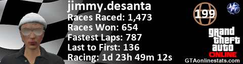 [URL=http://GTAonlinestats.com/showplayer/jimmy.desanta][IMG]http://GTAonlinestats.com/racesignature/jimmy.desanta/sig.png[/IMG][/URL]