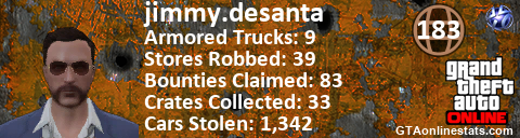 [URL=http://GTAonlinestats.com/showplayer/jimmy.desanta/2][IMG]http://GTAonlinestats.com/crimesignature/jimmy.desanta/2/sig.png[/IMG][/URL]