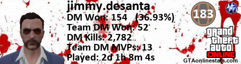 [URL=http://GTAonlinestats.com/showplayer/jimmy.desanta/2][IMG]http://GTAonlinestats.com/dmsignature/jimmy.desanta/2/sig.png[/IMG][/URL]