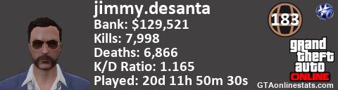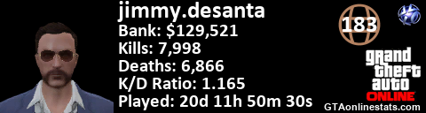 [URL=http://GTAonlinestats.com/showplayer/jimmy.desanta/2][IMG]http://GTAonlinestats.com/signature/jimmy.desanta/2/sig.png[/IMG][/URL]