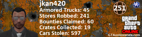 <a href="http://GTAonlinestats.com/showplayer/jkan420"><img src="http://GTAonlinestats.com/randomsignature/jkan420/sig.png" alt="jkan420" border="0" /></a>