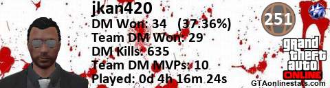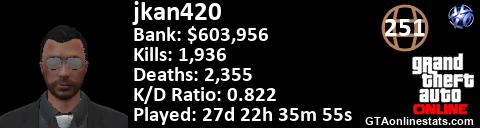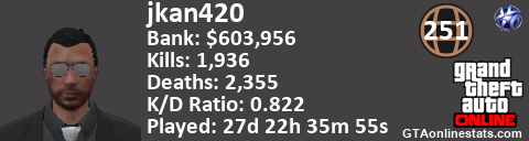 <a href="http://GTAonlinestats.com/showplayer/jkan420"><img src="http://GTAonlinestats.com/dmsignature/jkan420/sig.png" alt="jkan420" border="0" /></a>
