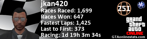 <a href="http://GTAonlinestats.com/showplayer/jkan420"><img src="http://GTAonlinestats.com/racesignature/jkan420/sig.png" alt="jkan420" border="0" /></a>