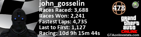 [URL=http://GTAonlinestats.com/showplayer/john_gosselin][IMG]http://GTAonlinestats.com/racesignature/john_gosselin/sig.png[/IMG][/URL]