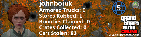 [URL=http://GTAonlinestats.com/showplayer/johnboiuk/2][IMG]http://GTAonlinestats.com/crimesignature/johnboiuk/2/sig.png[/IMG][/URL]