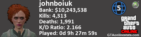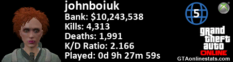 [URL=http://GTAonlinestats.com/showplayer/johnboiuk/2][IMG]http://GTAonlinestats.com/greysignature/johnboiuk/2/sig.png[/IMG][/URL]