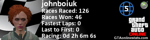 [URL=http://GTAonlinestats.com/showplayer/johnboiuk/2][IMG]http://GTAonlinestats.com/racesignature/johnboiuk/2/sig.png[/IMG][/URL]