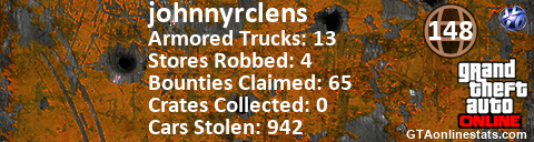 [URL=http://GTAonlinestats.com/showplayer/johnnyrclens][IMG]http://GTAonlinestats.com/randomsignature/johnnyrclens/sig.png[/IMG][/URL]