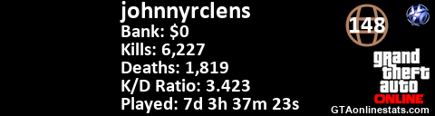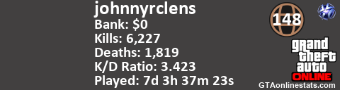 [URL=http://GTAonlinestats.com/showplayer/johnnyrclens][IMG]http://GTAonlinestats.com/dmsignature/johnnyrclens/sig.png[/IMG][/URL]