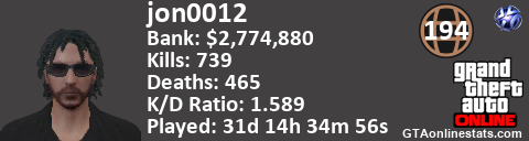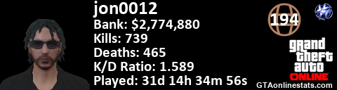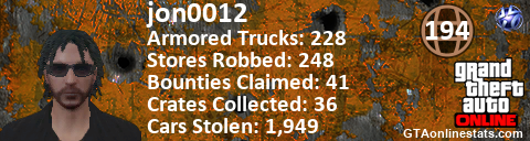 [URL=http://GTAonlinestats.com/showplayer/jon0012][IMG]http://GTAonlinestats.com/signature/jon0012/sig.png[/IMG][/URL]