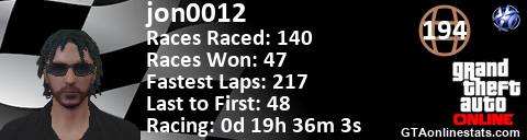 [URL=http://GTAonlinestats.com/showplayer/jon0012][IMG]http://GTAonlinestats.com/racesignature/jon0012/sig.png[/IMG][/URL]