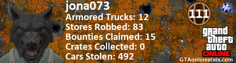 [URL=http://GTAonlinestats.com/showplayer/jona073][IMG]http://GTAonlinestats.com/crimesignature/jona073/sig.png[/IMG][/URL]