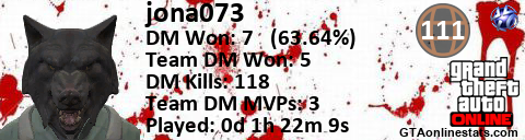 [URL=http://GTAonlinestats.com/showplayer/jona073][IMG]http://GTAonlinestats.com/dmsignature/jona073/sig.png[/IMG][/URL]